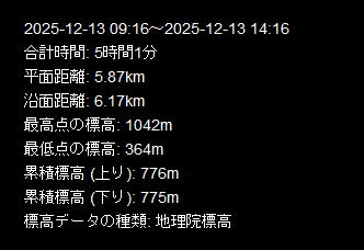| 「山旅ロガー」データ(時間計、最高・最低標高には多少誤差があります) | ||