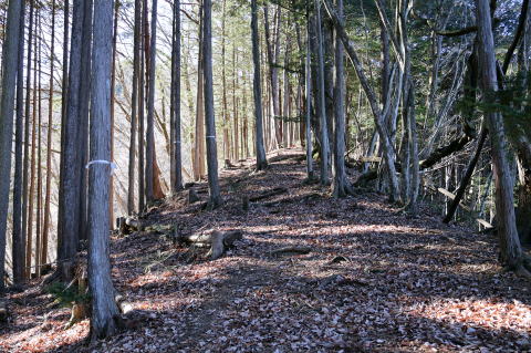 | 尾根に出るとなだらかな道になりました | 10:11 標高760m辺りの平坦な所 落ち葉で道はハッキリしないがテープが目印です |