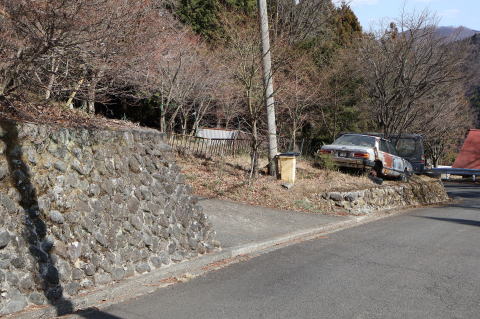 | 道路に出ました、正面の道を進みます | 道路脇に朽ちた道案内が残っています かすかに「藤倉バス停」とあります |